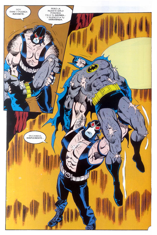 On ne pouvait pas parler de héros torturé ni de costume noir sans passer sous silence le Batman, et c’est une statue le représentant en mauvaise posture durant Knightfall dans les mains de Bane qui a été sélectionnée. Bon, je triche un peu puisqu’il ne s’agit pas ici de la reprise d’une couverture mais d’une page de Batman #497 paru en 1993, néanmoins le principe reste le même pour un résultat convaincant dans cette reprise d’une page entrée dans la postérité et réalisée par Jim Aparo et Dick Giordano dont les apports à la légende du Chevalier Noir n’étaient déjà plus à prouver depuis longtemps.